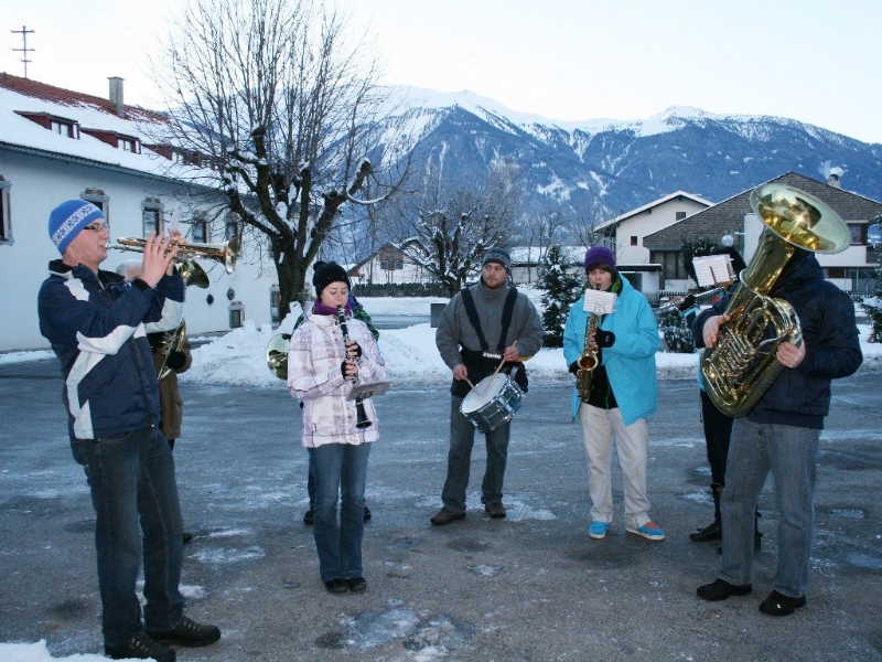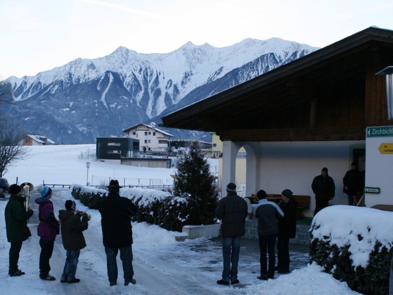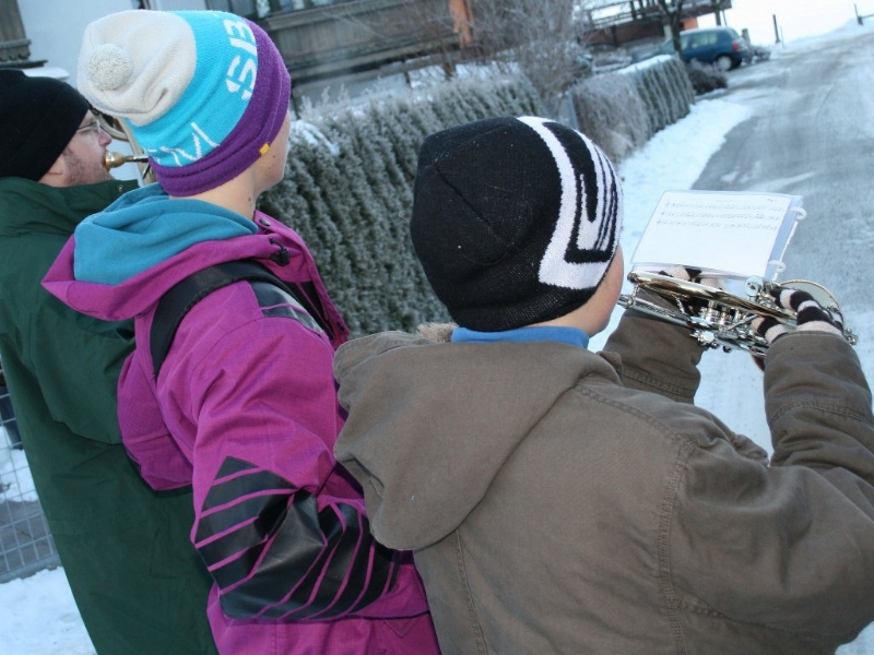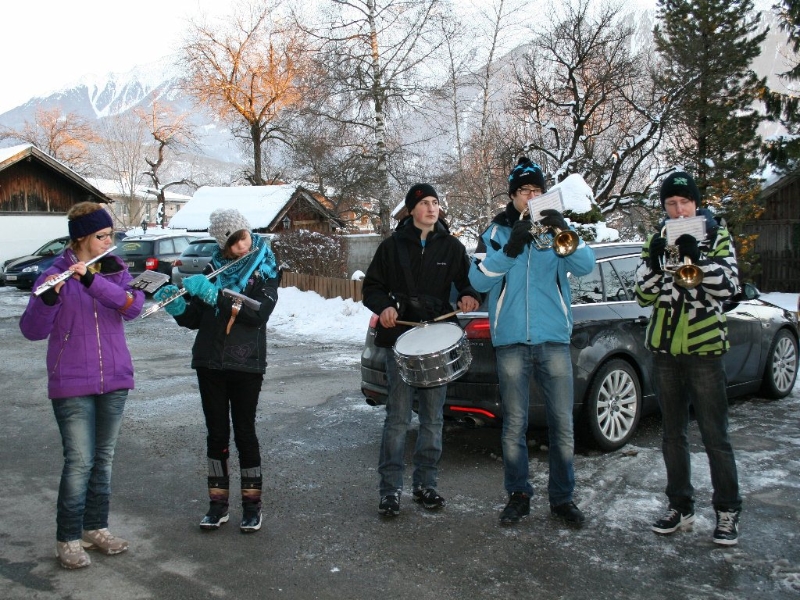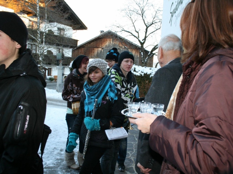 „Die jungen Musikerinnen und Musiker der MK Mieming erinnern sich nicht mehr daran“, erzählt der langgediente Klarinettist Andreas Fischer, „aber vor vielen Jahren kam mal die Idee auf, nur noch an Plätzen in Mieming zu spielen. Die Kräfte sollten gebündelt werden. Daraufhin gab es einen beeindruckenden Protest, quer durch unsere Gemeinde und seither gehen wir am Silvestertag wieder von Haus zu Haus“. Die meisten warten schon auf die Silvesterbläser. Aus langjähriger Erfahrung wissen sie sehr genau, wann sie ungefähr zum eigenen Haus kommen. Jede Spende ist willkommen. Gelegentlich wird ein Schnapserl oder ein Punsch gereicht. „Bis zu 20 sind am Tag zu schaffen“, verrät uns ein Alt-Profi.