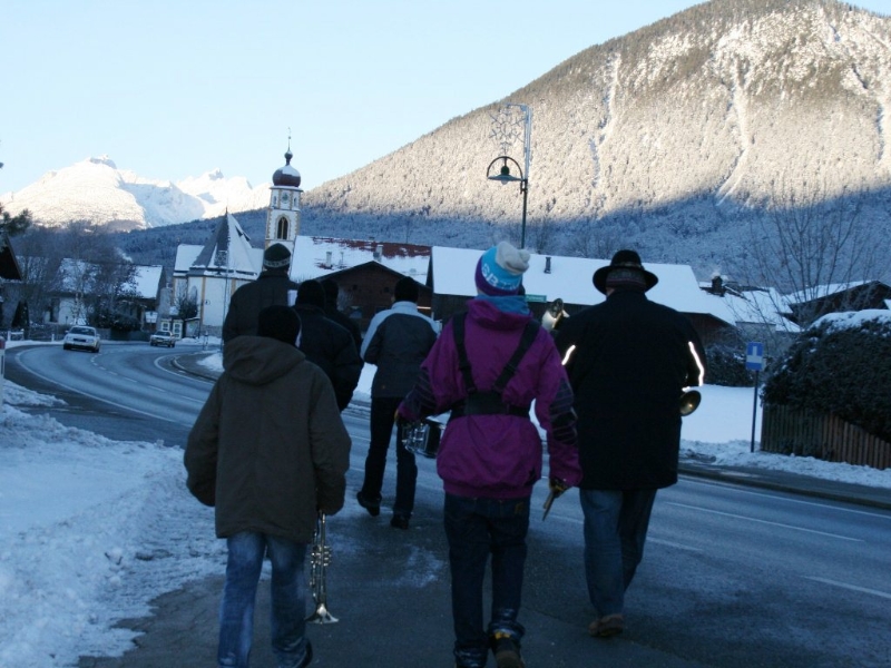 „Das Silvesterblasen gibt es in Mieming seit Anfang 1930“, erklärt Hannes Spielmann, Obmann der Musikkapelle Mieming. In den 60er und Anfang der 70er Jahre waren es zwei Gruppen, die vor jedem Haus „a guat’s nuis Jahr“ wünschten – die „Obere“ und die „Untere“ Partie. Die Gemeinde ist in den vergangenen Jahren sehr stark gewachsen, deshalb teilen sich den Neujahrsbrauch heute fünf Partien. Heuer gingen 42 Musiker mit 12 Begleitern als Silvesterbläser durch alle Ortsteile und Weiler Miemings. Unsere Fotoreportage begann am frühen Morgen, am Hof von Benedikt van Staa, am Zirchbichl in Barwies.