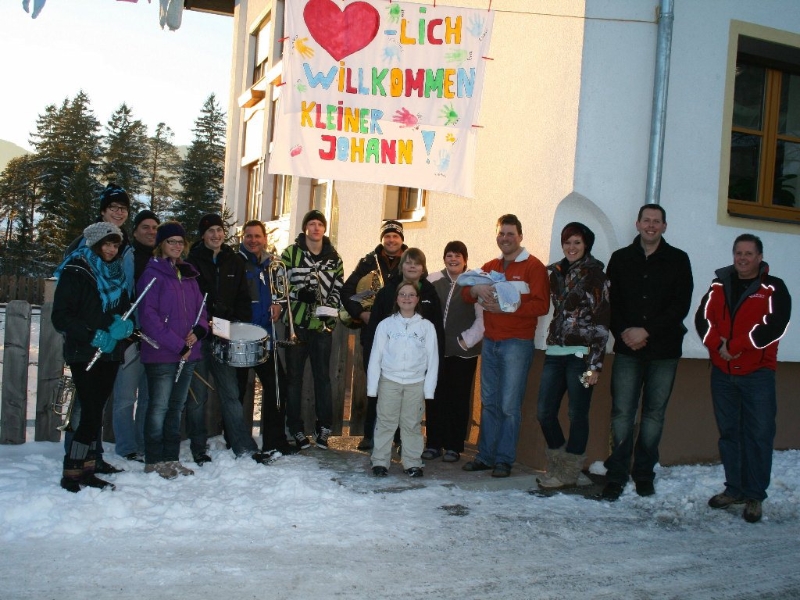 Wie immer, wenn die Mieminger Silvesterbläser auf dem Weg sind, gibt es viele Erlebnisse und am Ende Geschichten, die den Tag überdauern. So entstand das Silvester-Foto des Jahres im Haus der Familie von Barbara und Martin Spielmann in Obermieming. Ein großes Transparent verkündete, von weitem sichtbar, das freudige Ereignis: „Herzlich Willkommen kleiner Johann!“ – Johann Hannes Spielmann erblickte am 29. Dezember 2010 um 6-Uhr-43 im Krankenhaus Hall das Licht der Welt. Zum Auftakt brachte er ein Eigengewicht von 3310 Gramm auf die Waage. „Noch am gleich Tag wurde Johann, qua Eintrag ins Geburtenregister, ein waschechter Mieminger“, kommentierte Standesbeamtin Burgi Widauer.