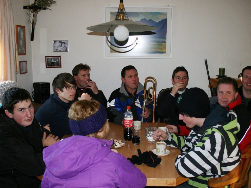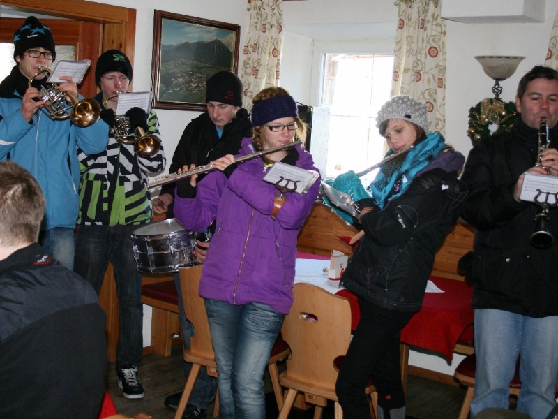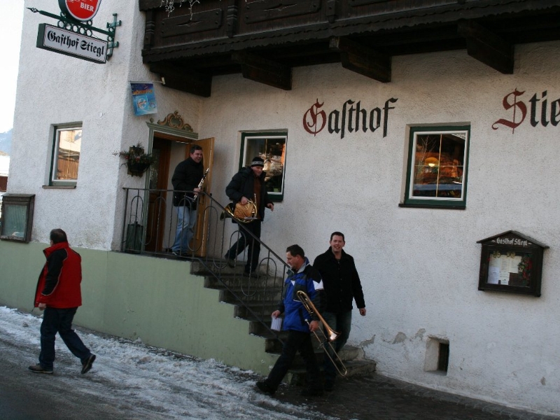 Auf dem Weg zu ihrem jeweiligen Ziel ließen sich unsere Silvesterbläser auf vielerlei Art stärken. Nach dem Auftakt gab’s ein Frühstück: Die neue Bäckerei in Obermieming und der M-Preis in Barwies spendierten Fleichkassemmeln und beim Neuwirt in Untermieming wurden Würstljausen serviert. Für die Partie in Untermieming-Dorf spendierte am Mittag Stiegl-Wirtin Hilde Kranebitter große Platten mit Rippelen, Pizzen wurden im „Romantika“ in Barwies gereicht. Mittagsgastgeber waren auch die Familien Schlierenzauer, Gantioler und Kraler. Abendessen gab es im Gasthaus zur Post, bei der Familie Alber in Zein, im Hotel Schwarz in Obermieming, in der Moosalm, Barwies und Georg Mair (Höhenweg) spendierte zum Abschluss ein gutes Gulasch.