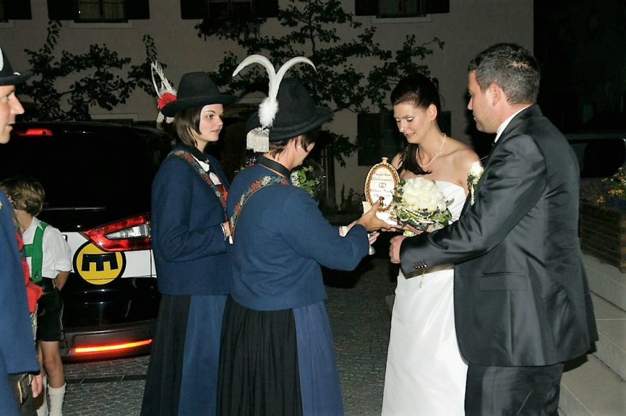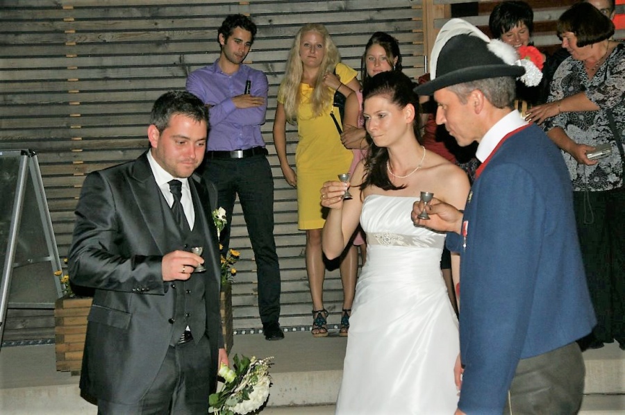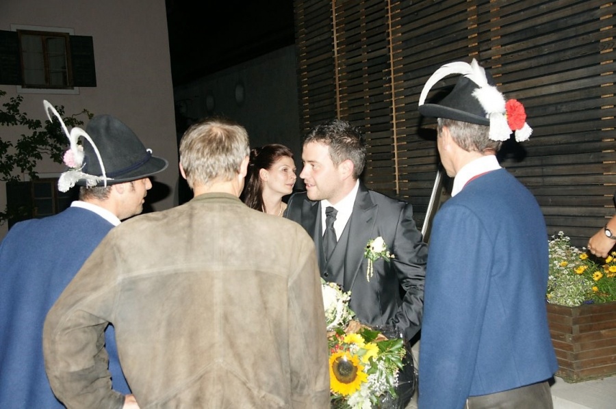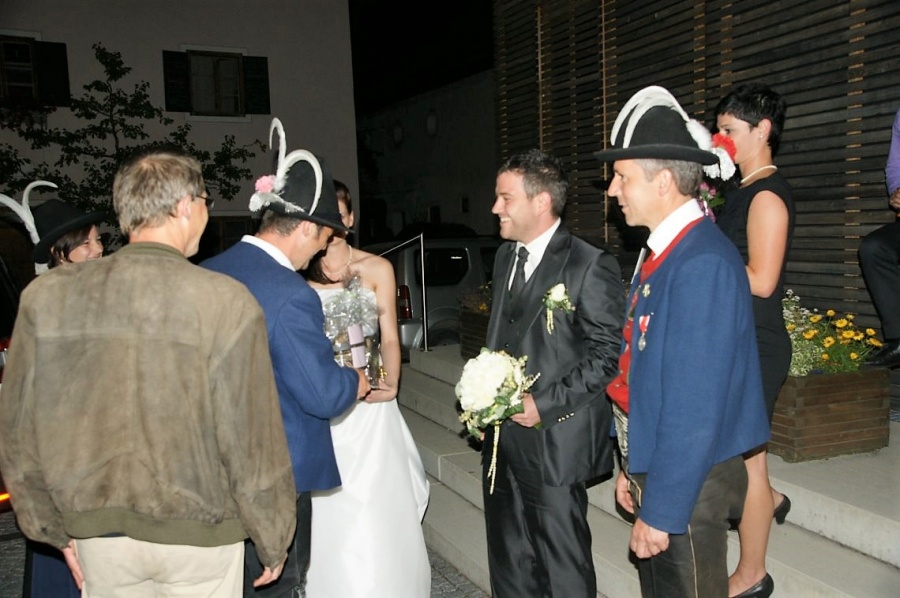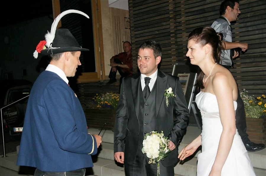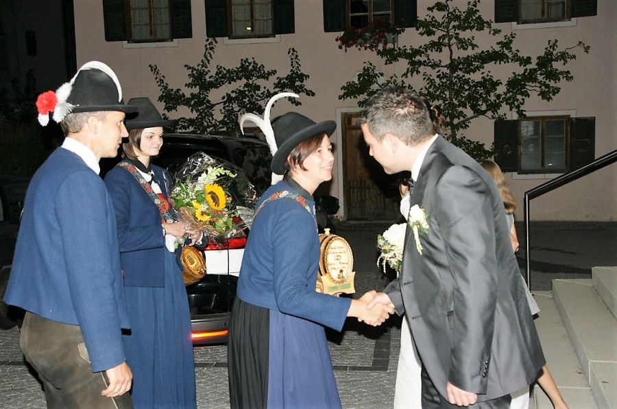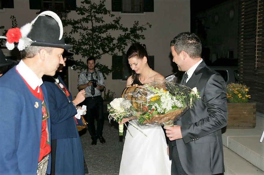 Zur Agape am Kirchplatzl spielte nach der Hochzeits-Zeremonie die Mieminger Tanzlmusig auf und sie gaben sich dabei die größte Mühe. Immerhin spielten sie zu Ehren zweier der Ihren: Sowohl Katrin, geb. Sonnweber, als auch Thomas Witsch sind Musikanten. Katrin noch immer eine recht aktive, Thomas ist ein ehemaliger Musikant.Zur Feier vor dem Gemeindezentrum in Wildermieming spielte die Musikkapelle, unter der Leitung von Kapellmeister Christian Holzeis ein Hochzeitsständchen. Anschließend gab es das traditionelle Geschenk der Musikkapelle für das Hochzeitspaar – ein Schnapsfässchen mit Widmung.