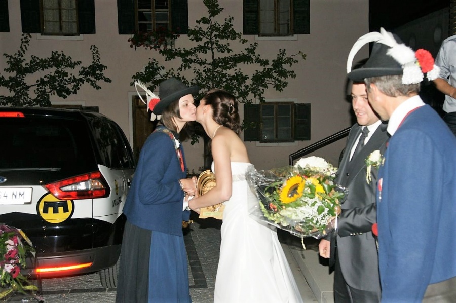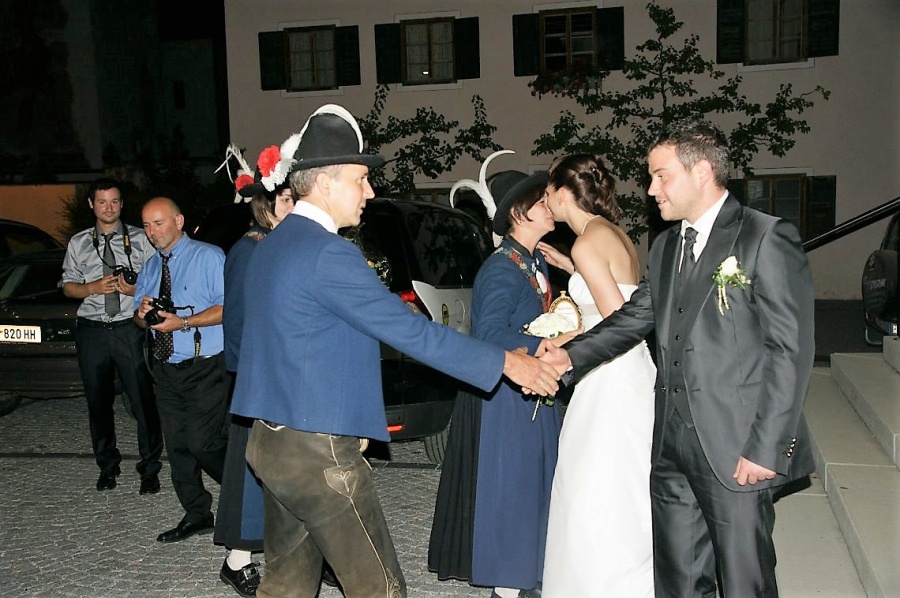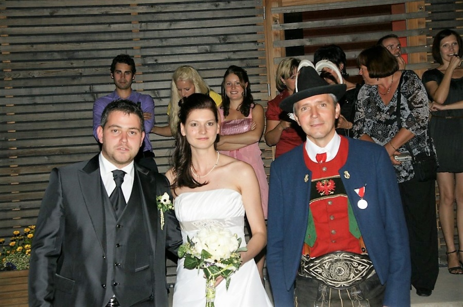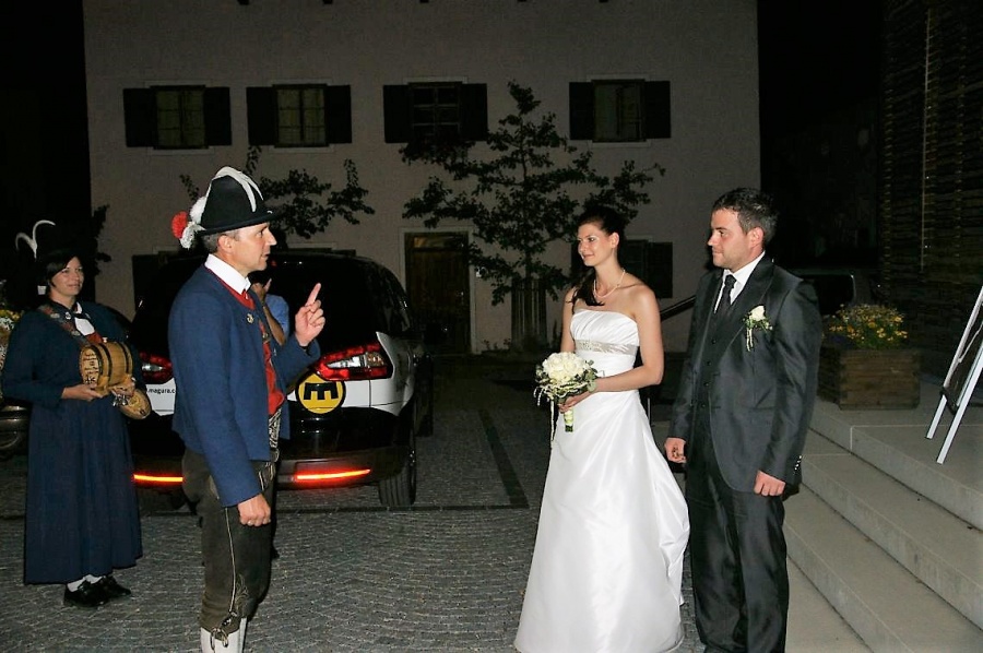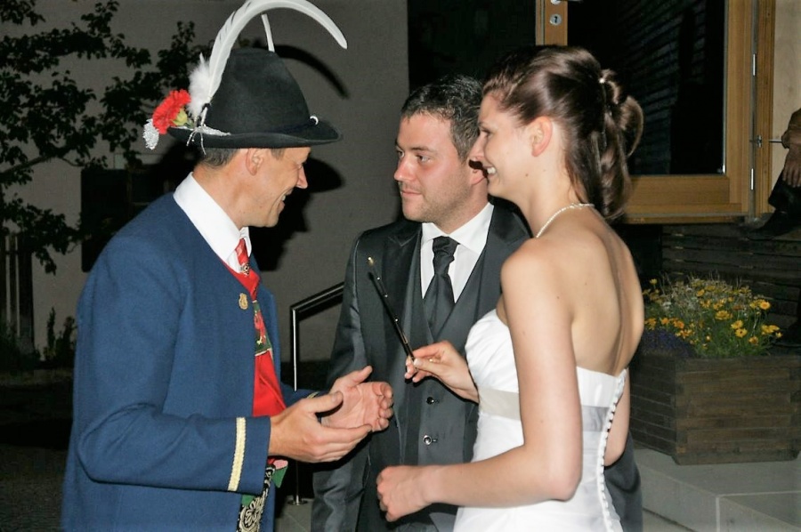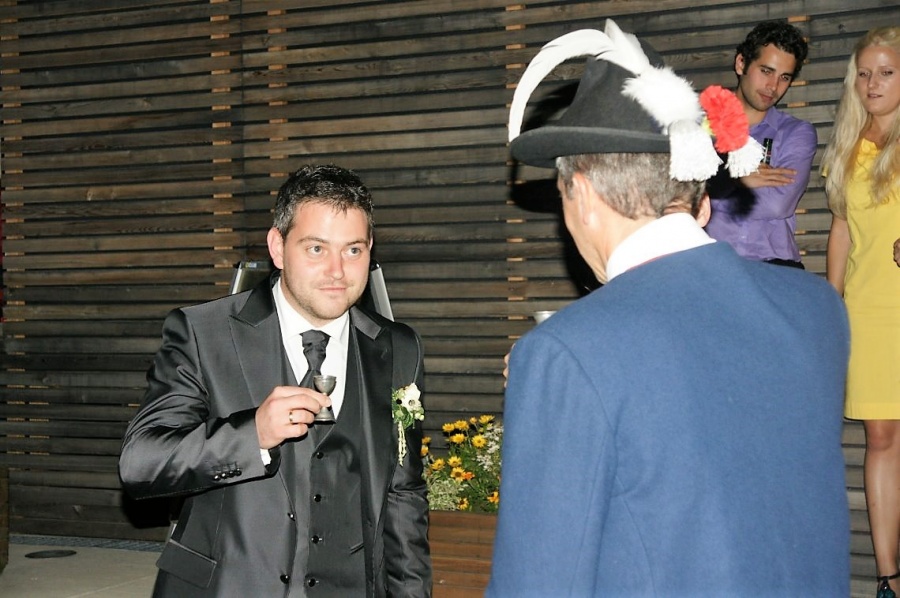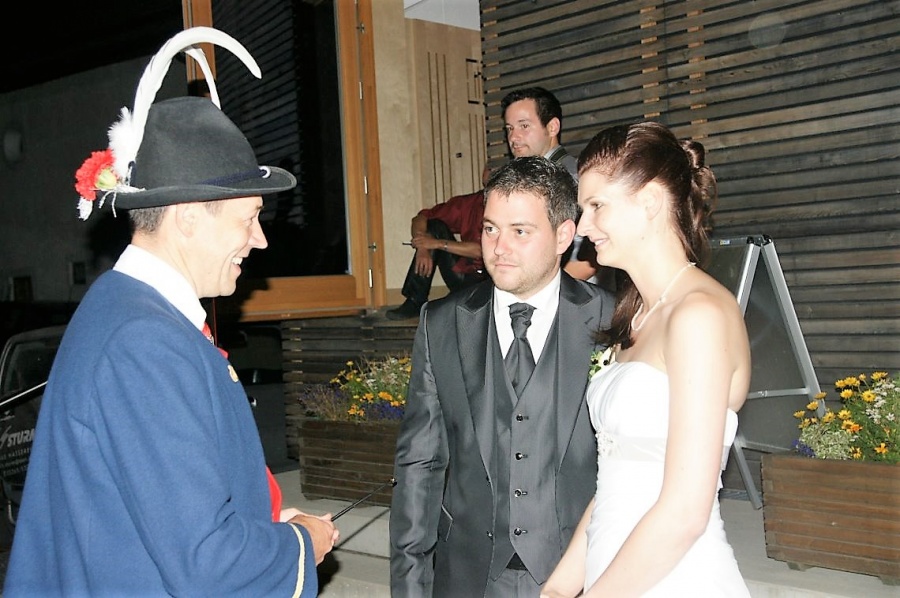 Zur Agape am Kirchplatzl spielte nach der Hochzeits-Zeremonie die Mieminger Tanzlmusig auf und sie gaben sich dabei die größte Mühe. Immerhin spielten sie zu Ehren zweier der Ihren: Sowohl Katrin, geb. Sonnweber, als auch Thomas Witsch sind Musikanten. Katrin noch immer eine recht aktive, Thomas ist ein ehemaliger Musikant.Zur Feier vor dem Gemeindezentrum in Wildermieming spielte die Musikkapelle, unter der Leitung von Kapellmeister Christian Holzeis ein Hochzeitsständchen. Anschließend gab es das traditionelle Geschenk der Musikkapelle für das Hochzeitspaar – ein Schnapsfässchen mit Widmung.