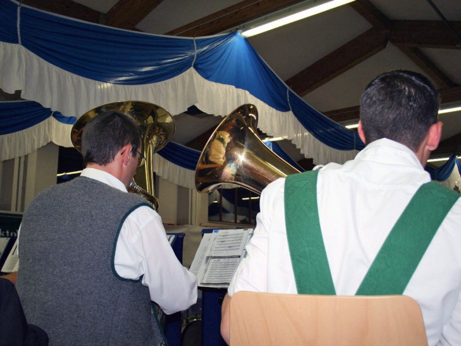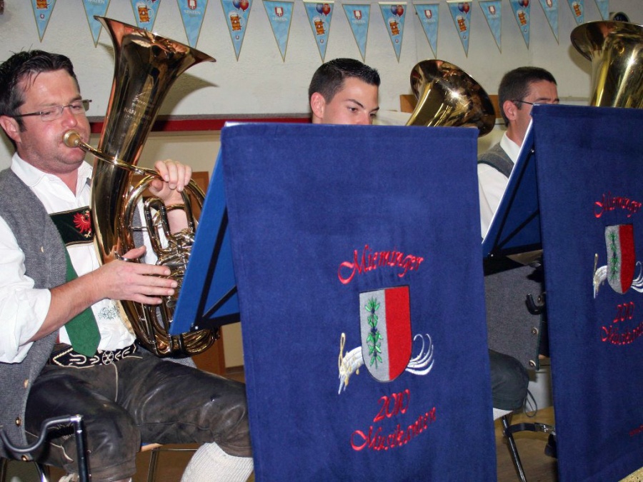 Und die Feuerwehr hat sich mit der Ausrichtung des Oktoberfestes in hohem Maße selbst übertroffen: Weit über 100 Meter Weißblaue Leinen-Girlanden, Wimpel der Oktoberfestbier-Brauerei aus München, Tischtücher und Leinwände, die alles verdeckten, was im Feuerwehralltag unverzichtbar ist, machten aus der ansonsten zweckgebundenen Halle ein weißblau-fröhliches Festzelt. Dazu kamen der Bierausschank, Bänke und Tische und die ebenfalls bierfestlich geschmückte Bühne der Mieminger Musikanten. Die spielten nicht nur zünftige Blasmusik, sondern sahen mit ihren vier Marketenderinnen in geschmackvollen, königsblauen Dirndln insgesamt mehr als fesch aus. Die Mieminger Musikanten sind zehn aktive Musiker der Musikkapelle Mieming. Die musikalische Besetzung: Drei Bässe, vier Flügelhörner, zwei Klarinetten und ein Schlagzeug.