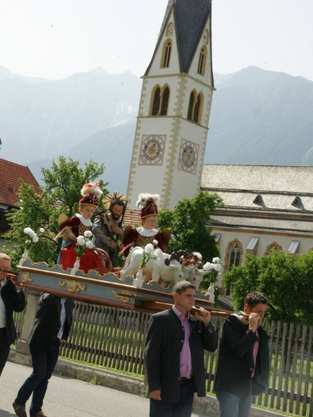 Die geschnitzte Figur des pflügenden Heiligen wird auf einem Podest getragen, flankiert von zwei kleinen Jungen, die die hilfreichen Engel darstellen. Heuer waren das der 4jährige Emanuel Grabner und der ebenfalls 4jährige Luis Krug. Für die Kinder ist das eine besondere Ehre, in prächtigen Rokoko-Gewändern an der Prozession teilnehmen zu dürfen. Ihre Väter tragen das Ferkulum. Die Prozession führt ein Engel mit Helm und Federbusch an, das war heuer der 10jährige Fabian Zankai. Ortsbäuerin und Pfarrgemeinderätin Michaela Maurer übernahm vor ein paar Jahren die Betreuung der Isidori-Engel von Angelika Messmer. Michaele Maurer: “Wir bevorzugen Buben, deren Familie die kirchlich-bäuerliche Tradition in Mieming vorleben. Dabei zu sein ist für die Buben und ihre Familien eine Ehre”. Die Mieminger Sänger tragen während der Prozession die Reliquie des Heiligen. Den Reliquienbehälter schuf ein Schwazer Goldschmied und er wird seit dem 25. Juni 1901 in Mieming aufbewahrt.