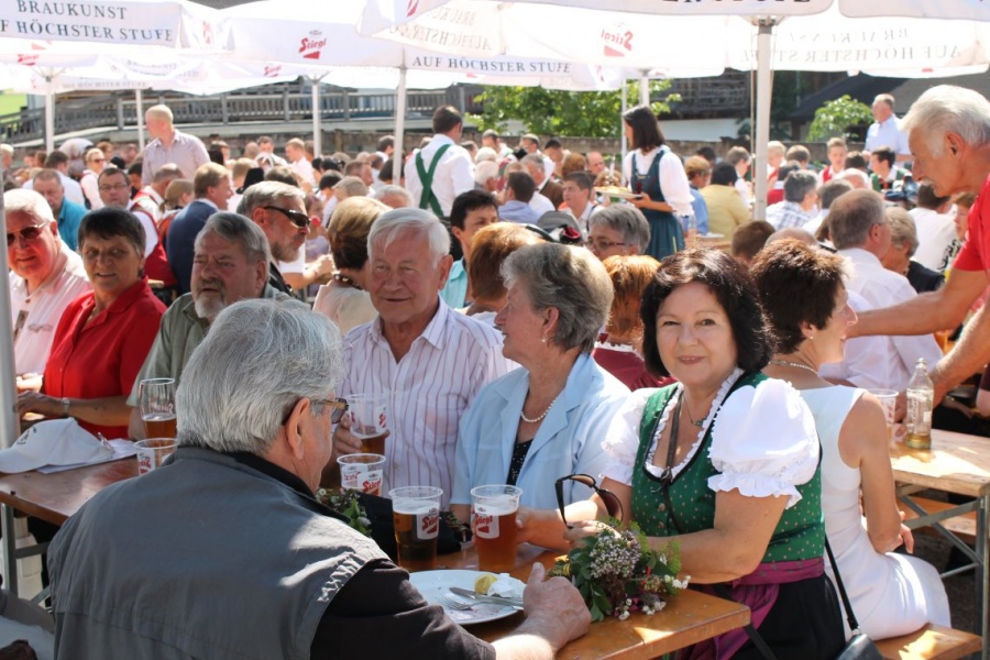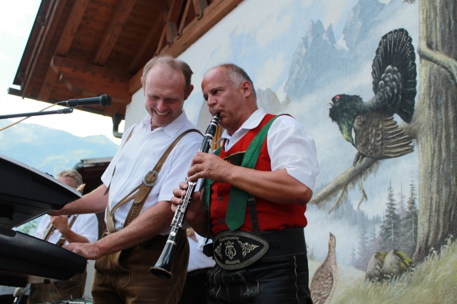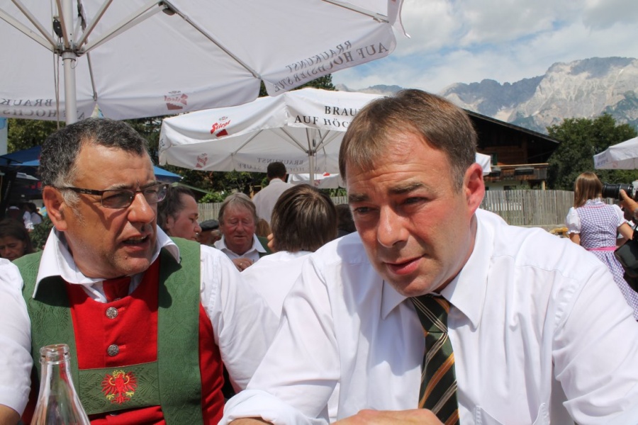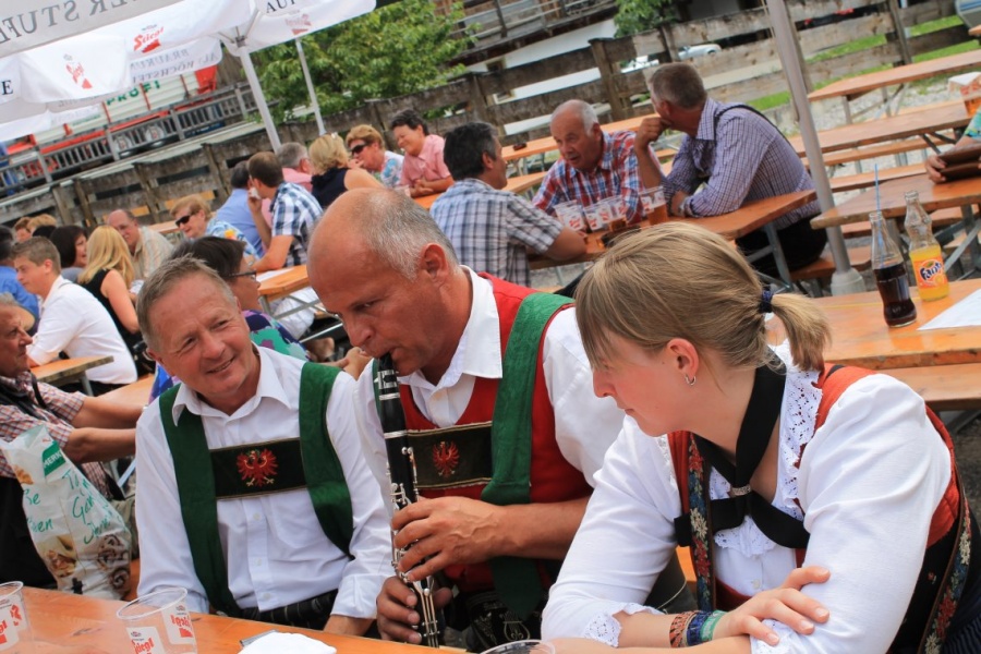 Beim Anschließenden Frühschoppen-Konzert beim Stiegl musizierten Markus Kranebitter und Freunde. Die Stimmung war vergleichbar gut, wie vor über einem Jahr beim Jubiläums-Fest “100 Jahre Gasthof Stiegl” (erinnert Ihr Euch noch an die Stiegl-Polka?). Das Küchen-Team um Mario Walch (Chef-Koch im Alpenresort Schwarz, 2 Hauben) reichte wohl insgesamt ca. 400 Essen. Das überschlug der Stiegl-Toni auf Nachfrage mal kurz im Kopf. Auf der Karte standen u.a. Schweinsbraten, Gulasch und Wiener Schnitzel. Der Feiertag war auch ein Familientag. Wie viel Liter bzw. Fässer Bier getrunken wurden, können wir nur ahnen. Ganz sicher waren das nicht wenige. Pfarrer Paulinus reihte sich in die große Schar der Gäste ein und war sichtlich vergnügt, als Maria Wieser mit einer übergroßen Kuchen-Platte kam und die noch Stück für Stück am Tisch verteilte.
