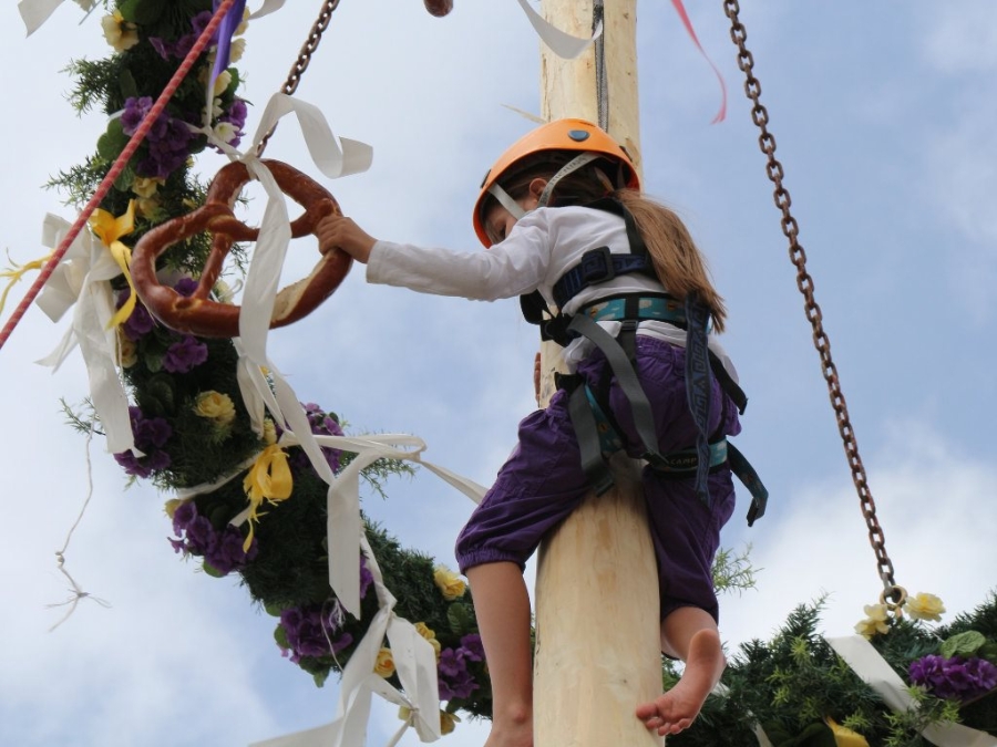 Gerad‘ gewachsen, am dafür vorgesehenen Platz fest verankert, vom Team der Bergrettung Mieming zum 2. Mal gesichert, von den Landfrauen herrlich geschmückt und sein weit ausladender Kranz, mit Super-großen Brez‘n und kuvertierten Einkaufsgutscheinen reichlich bestückt. Die Mieminger Bergretter waren Romana Mair, Manuel Wiesmann, Hannes Klein und Daniel Fischer. Sabrina, acht Jahre jung, war übrigens die Erste, die oben war.