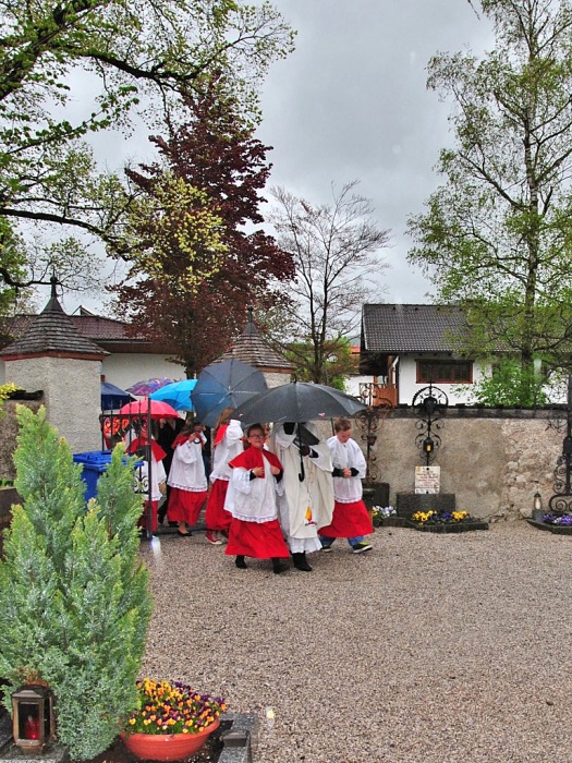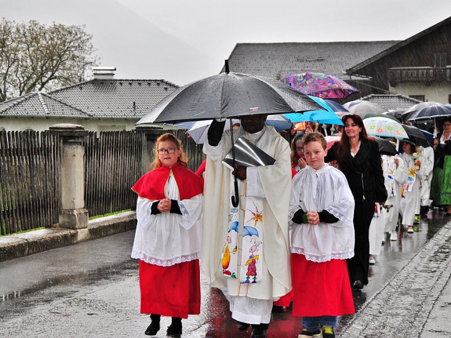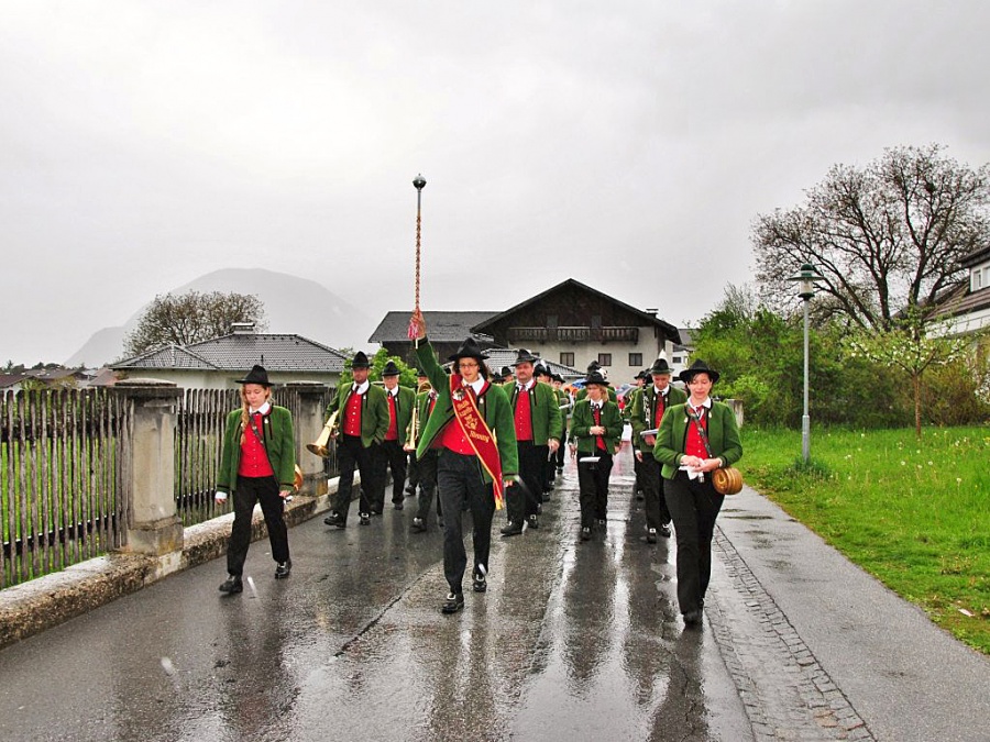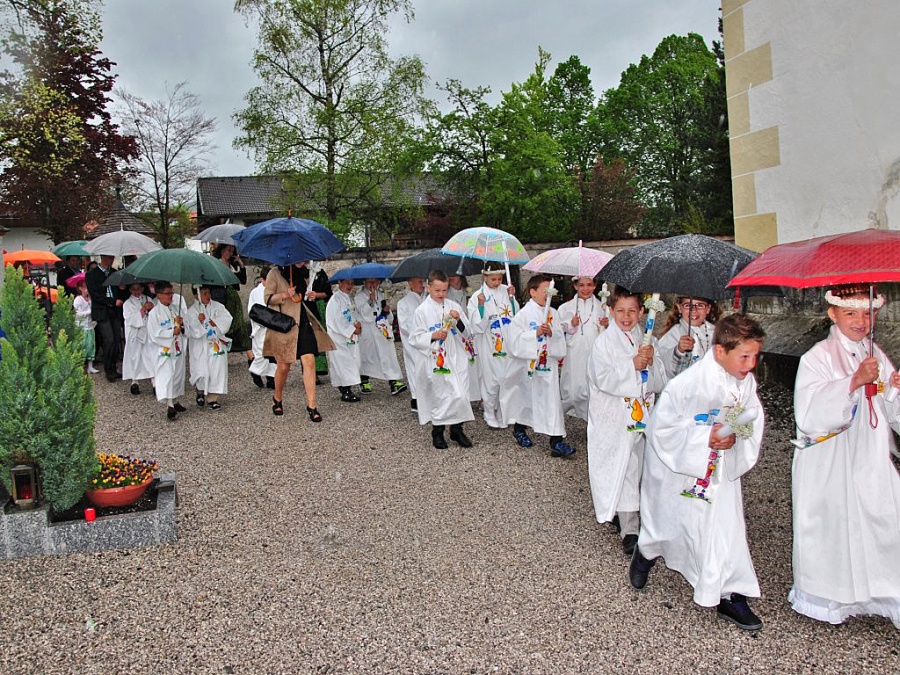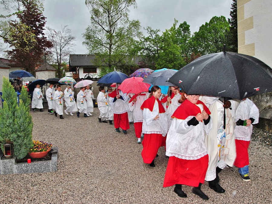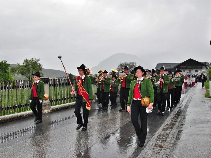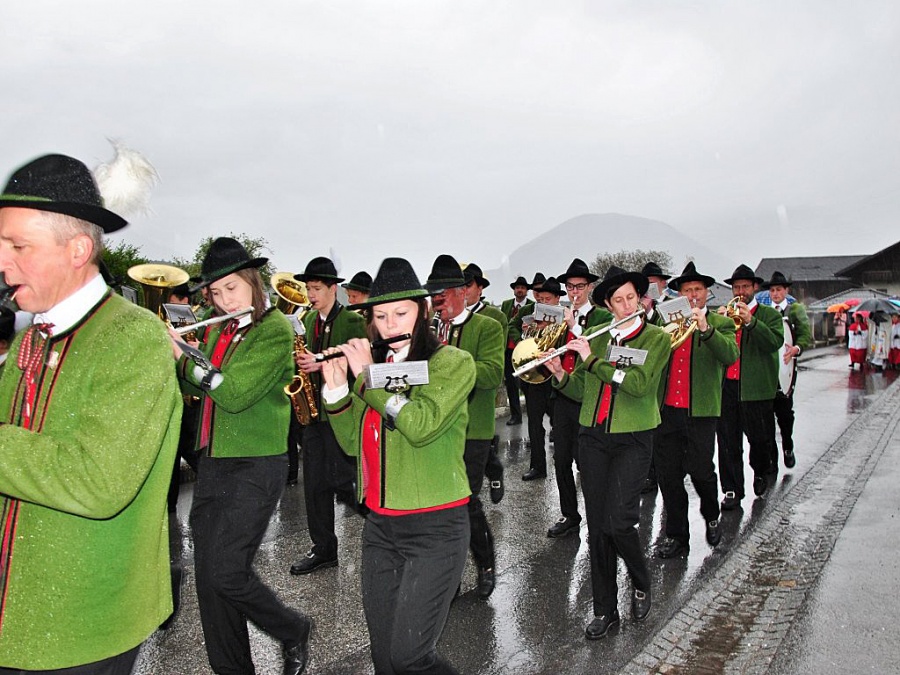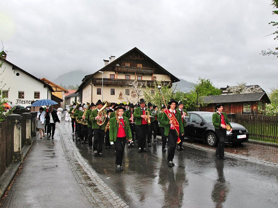 Auch die Musikkapelle Mieming ließ sich vom stürmischen Regen nicht abhalten und begleitete die Erstkommunion-Kinder. Das Motto der Erskommunionkinder war heuer “Du bist mein Freund”. Trotz des weniger guten Wetters feierten die Kinder der 2. Klasse einen feierlichen Gottesdienst mit Pfarrer Paulinus.
