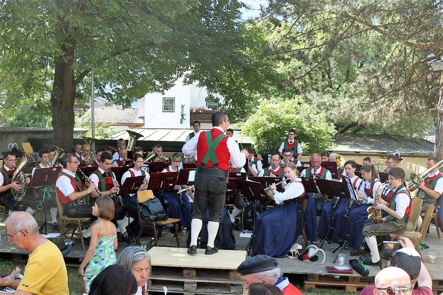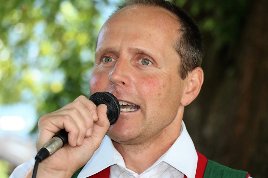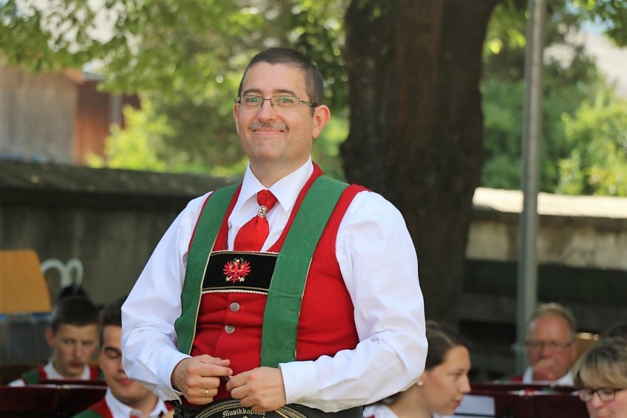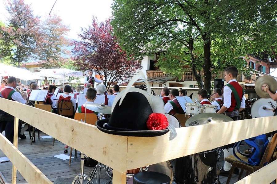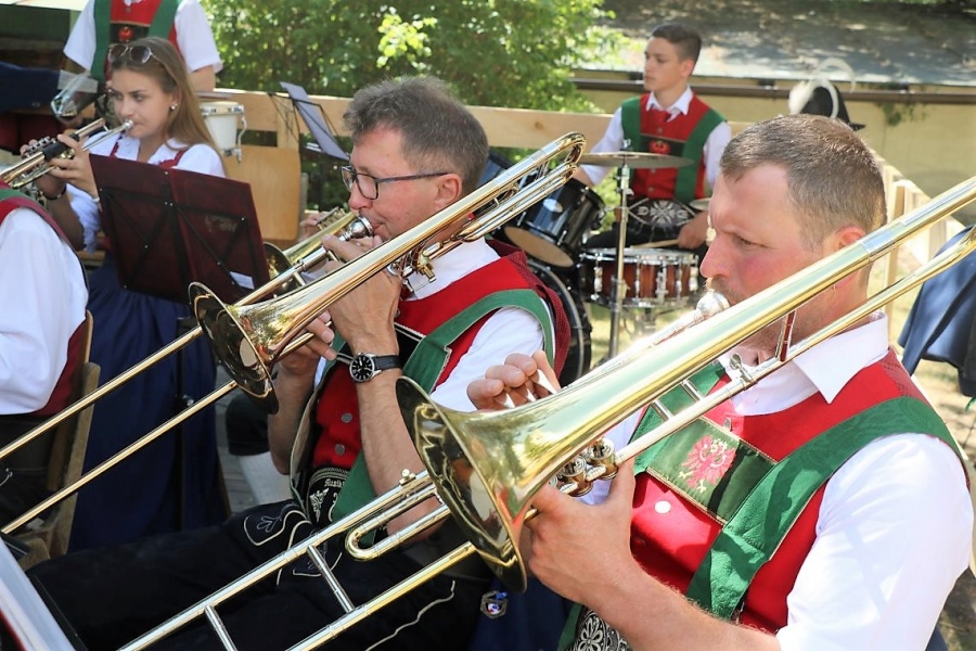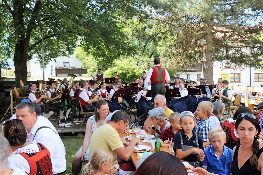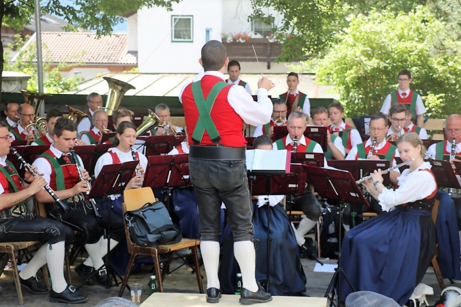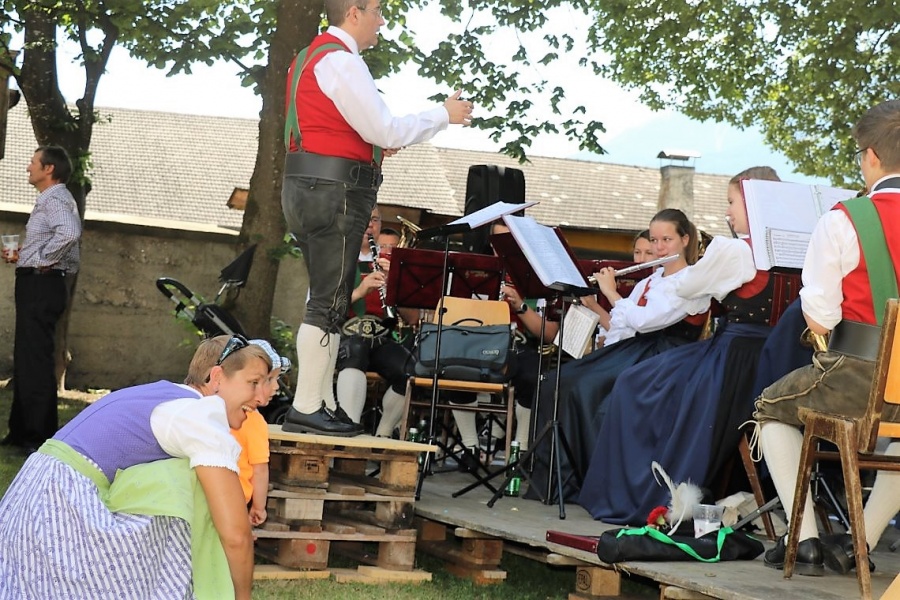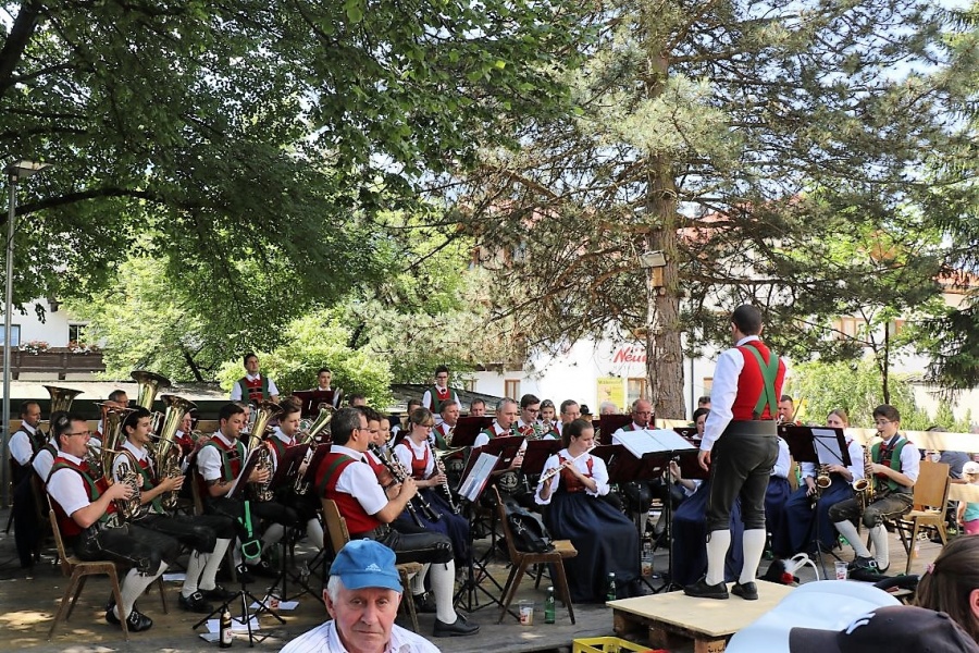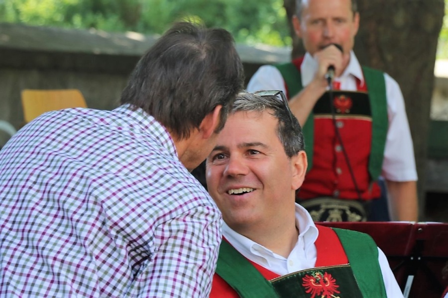 Nach dem Frühschoppenkonzert mit der Musikkapelle Mieming, spielte Marco Spiegl mit seiner steirischen Harmonika „Eine Insel unter Palmen“ und andere Hits seines vielfachen Repertoires. Der Schlagersänger wurde dabei von seinem eigens angereisten Fan-Club frenetisch unterstützt.