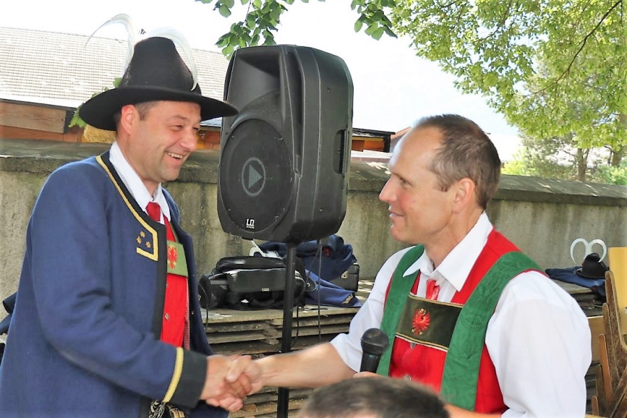 Die Mitglieder der Schützenkompanie gratulierten unter starkem Applaus aller Gäste ihrem Hauptmann Thomas Schneider mit Ehefrau Claudia zur Geburt ihrer Tochter Seraina (geb. 12. Juni 2017, um 20.20 Uhr). Die Musikkapelle Mieming spielt in Anlehnung an den „Standschützen-Marsch“ von Sepp Tanzer als exklusives Geburtstags-Ständchen den „Stammhalter-Marsch“.