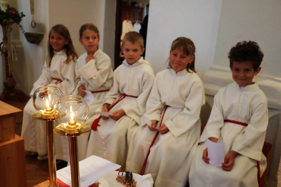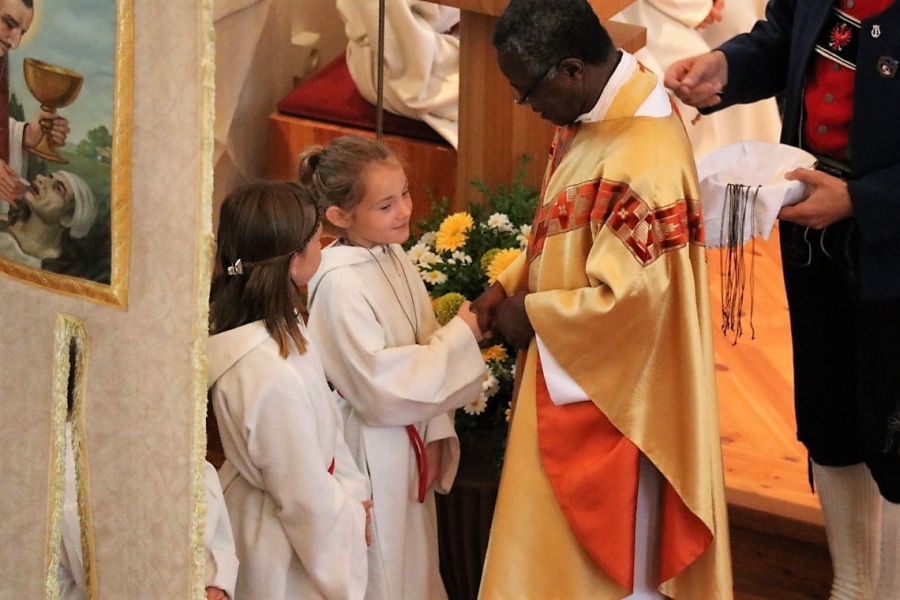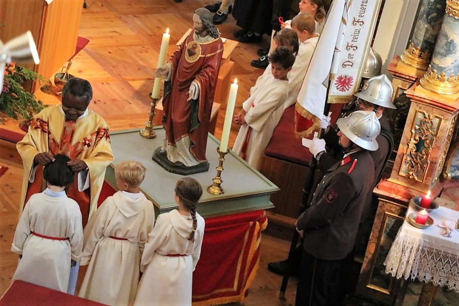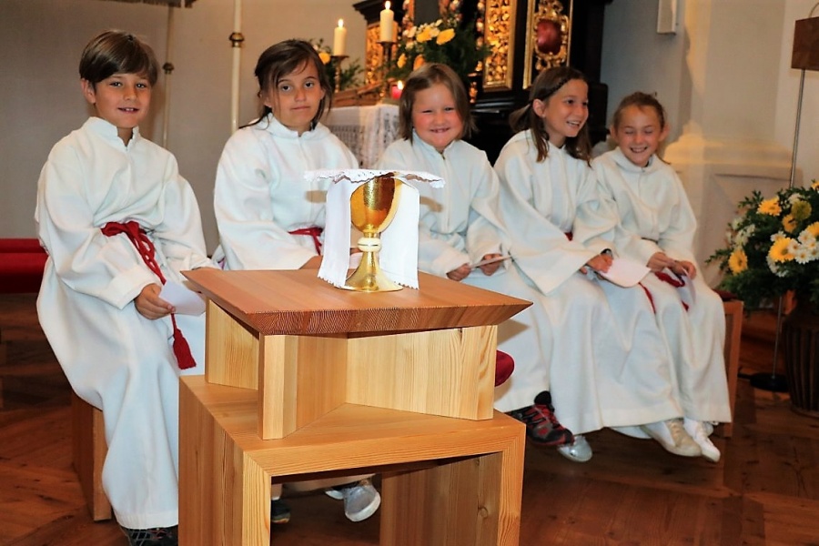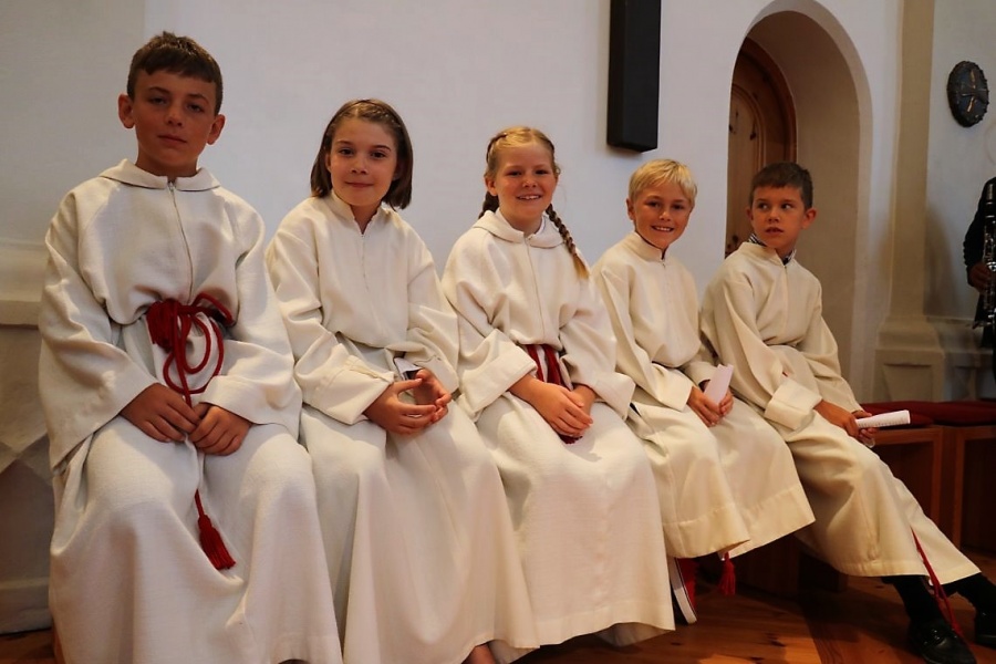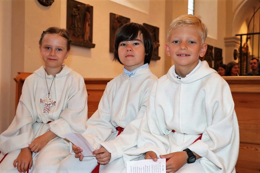 Für 18 Ministrantinnen und Ministranten war das heute eine ganz besonderer Feiertag. Die fünf hauptamtlichen Ministranten führten ihre 13 Nachfolgerinnen und Nachfolger ein, die heute offiziell ihr Amt als im liturgischen Dienst unserer Gemeinde antraten. Dazu erhielt jeder von Pfarrer Paulinus ein gesegnetes Holzkreuz. Pastoralassistent Xaver Schädle überreichte den neuen Messdienern einen Ausweis und begleitet nach dem Gebet zur Herz-Jesu-Gelöbniserneuerung die Gemeinde beim Singen des „Herz-Jesu-Bundesliedes“ an der Kirchen-Orgel.